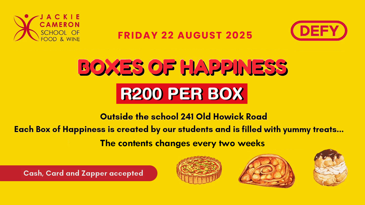 “Come grab a Box of Happiness on Friday 22 August! Students will be stationed outside of Jackie Cameron School of Food & Wine (next to the road). It’s first come first serve.”