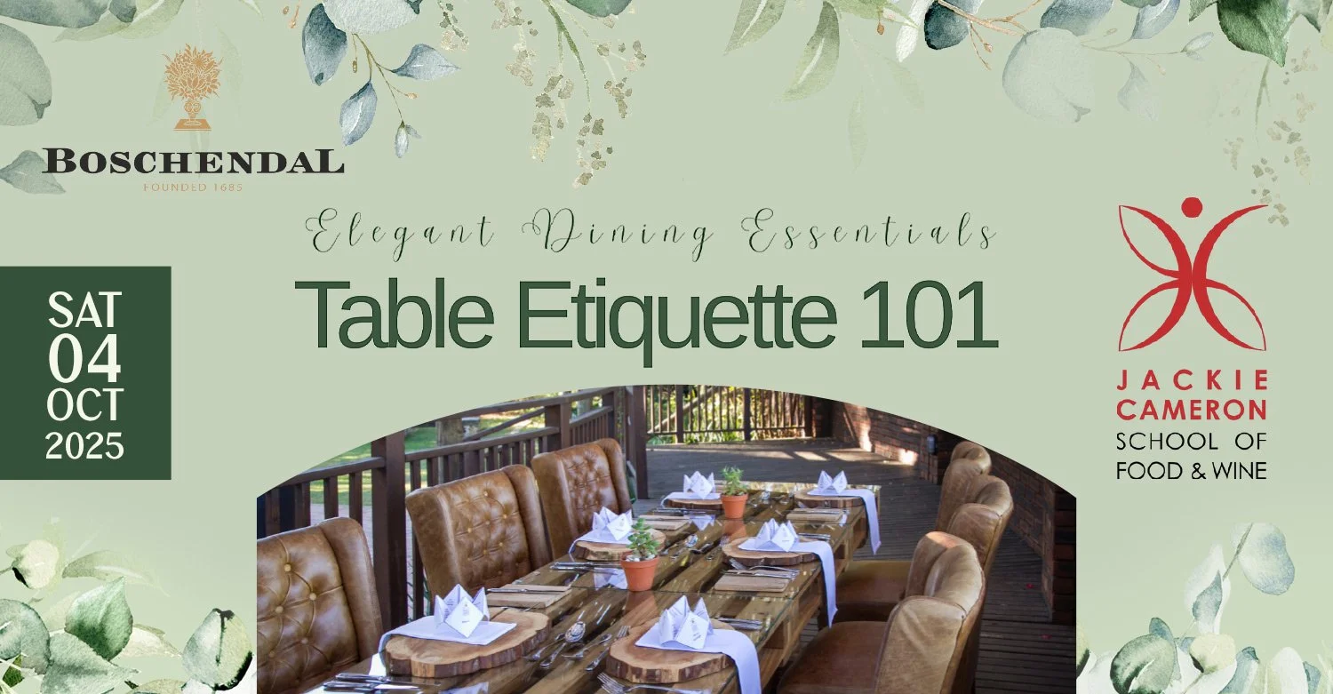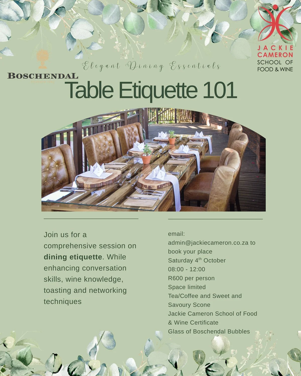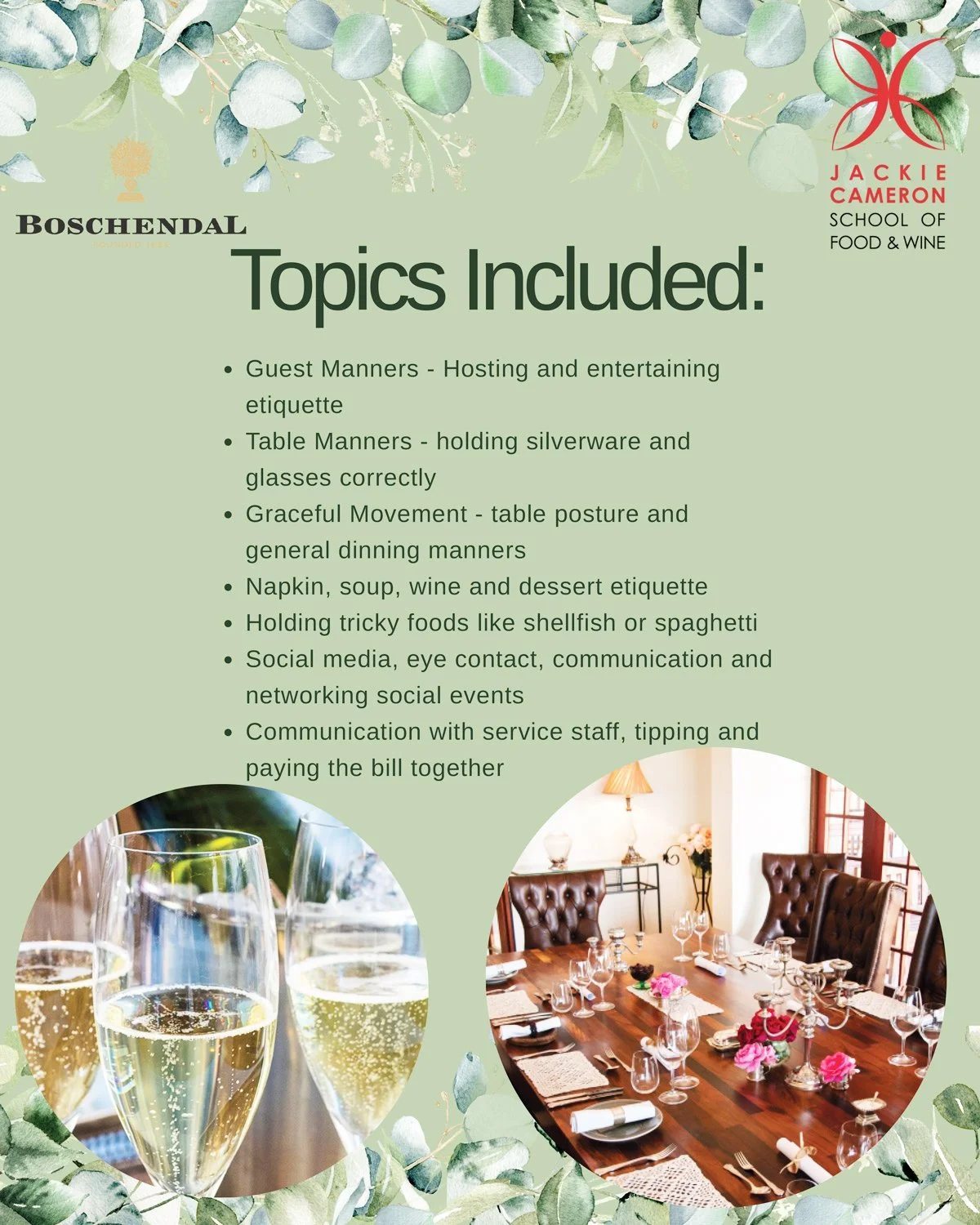 We will be hosting a comprehensive session on dining etiquette, while enhancing conversation skills, wine knowledge, toasting and networking techniques. Booking includes a glass of Boschendal bubbles, tea/coffee and sweet and savoury scones & Jackie Cameron School of Food & Wine Certificate.