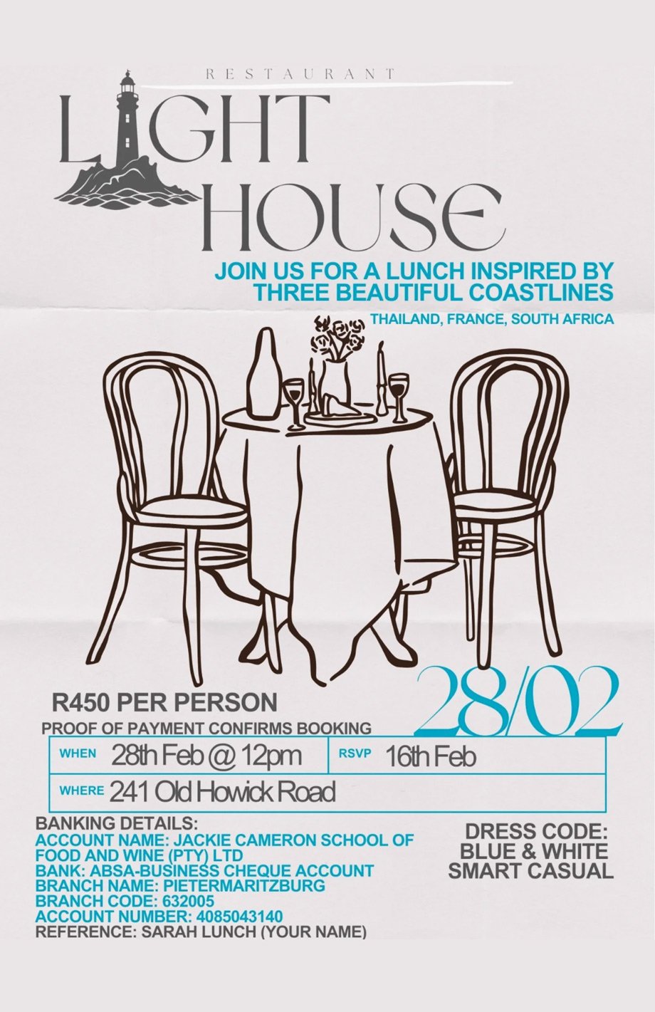 “Join us for a final lunch hosted by Sarah Le Roux, a talented 3rd-year student at the Jackie Cameron School of Food and Wine! Sarah will be showcasing her culinary skills with a delicious menu. Savour the flavours of South Africa, Thailand, and France. Don’t miss out on this incredible opportunity to taste these creations and support her as she prepares for the next step in her culinary career.”