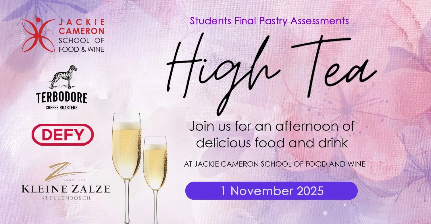 Experience an elegant afternoon of indulgence as our students present their final pastry assessments; a showcase of creativity, precision, and passion. Enjoy beautifully crafted sweet and savoury delights, perfectly paired with a glass of Kleine Zalze Bubbles and a comforting cup of Terbodore Coffee or tea.