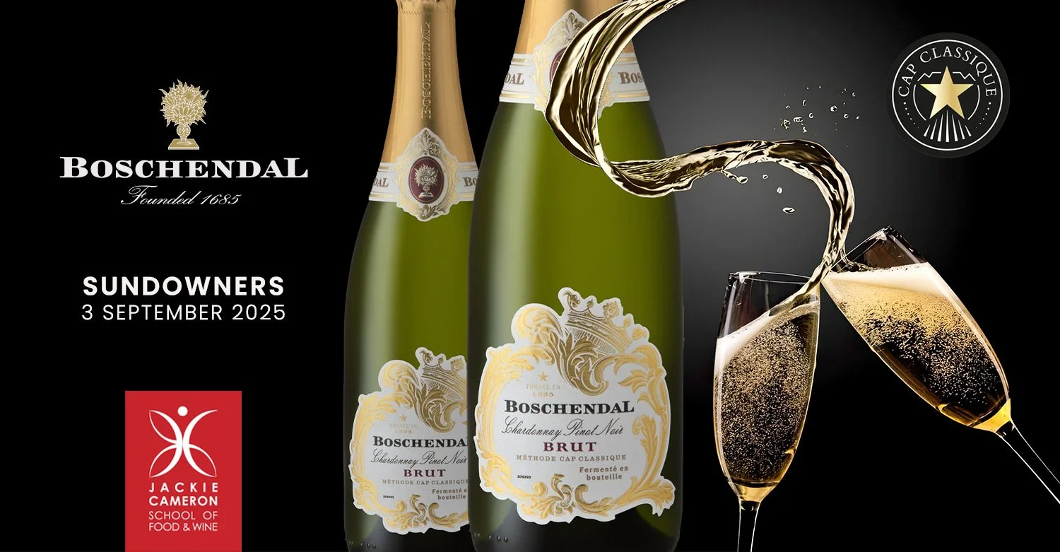 Join us on Wednesday 3 September at Jackie Cameron School of Food & Wine for a Sundowner With A Difference! We'll be showcasing Boschendal Wine Estate and our students will pair tastings for the various cultivars presented. This will be a relaxed, informal get-together of people who enjoy fine fare, and those who would like to gain an appreciation for this sociable activity. So, on the way home from work, stop off for a sundowner of a food-and-wine tasting, with a difference