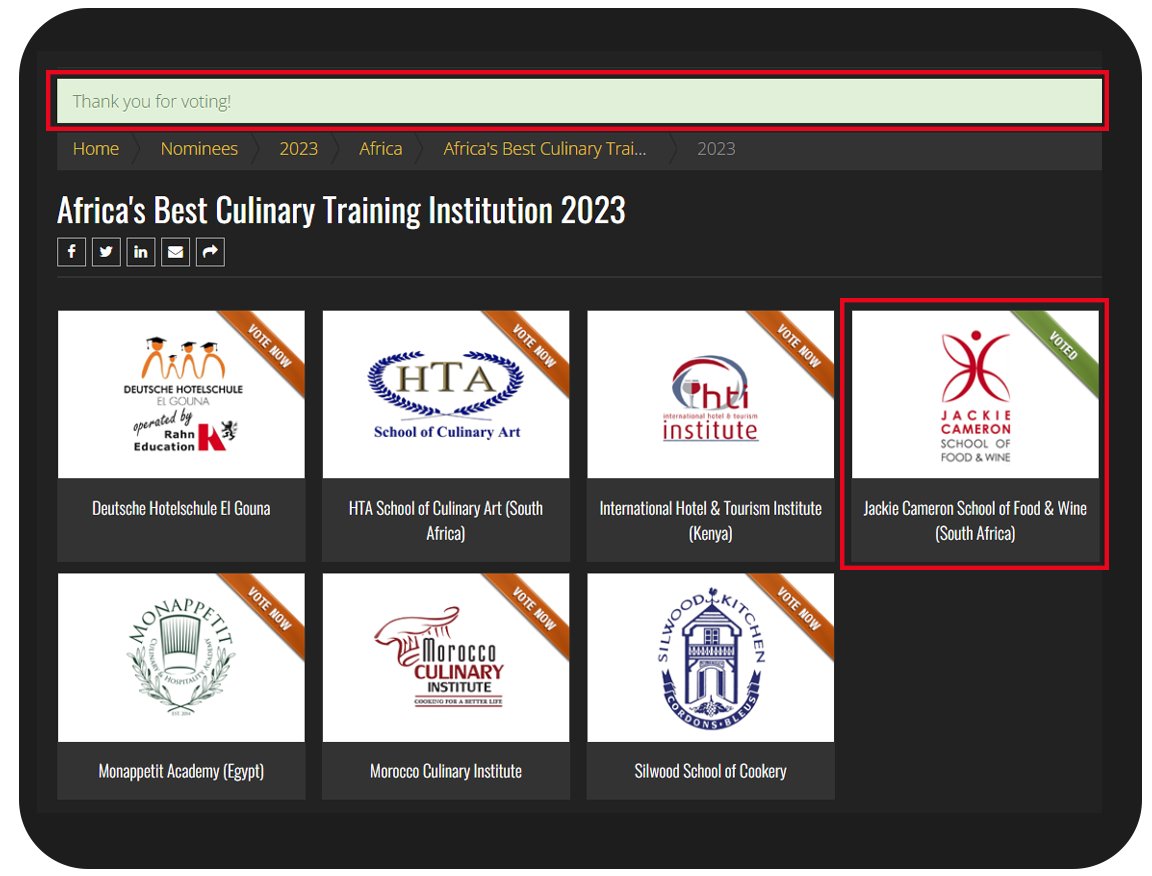 1. Follow the link above to the “Africa's Best Culinary Training Institution 2023” category and click on our logo.